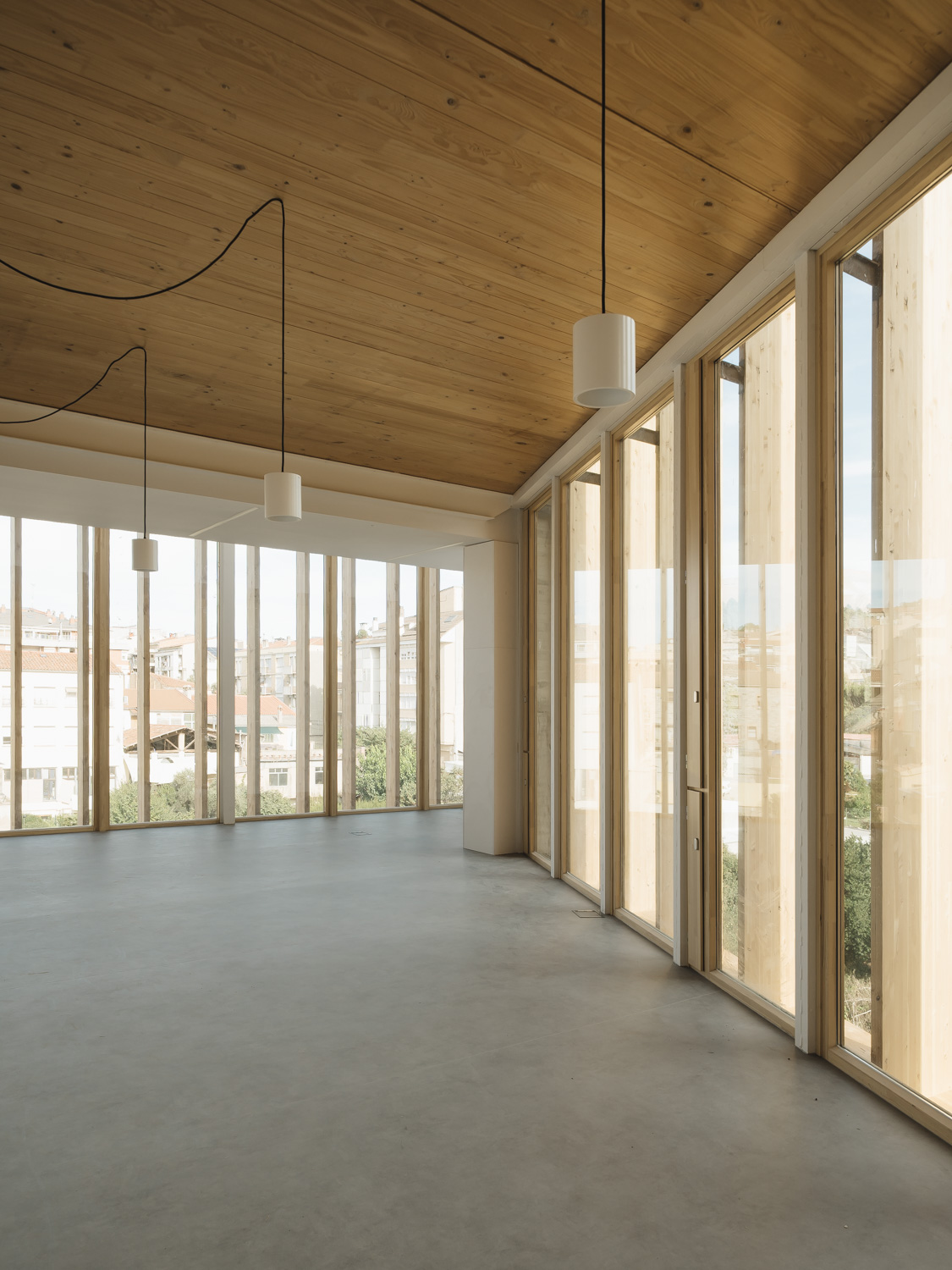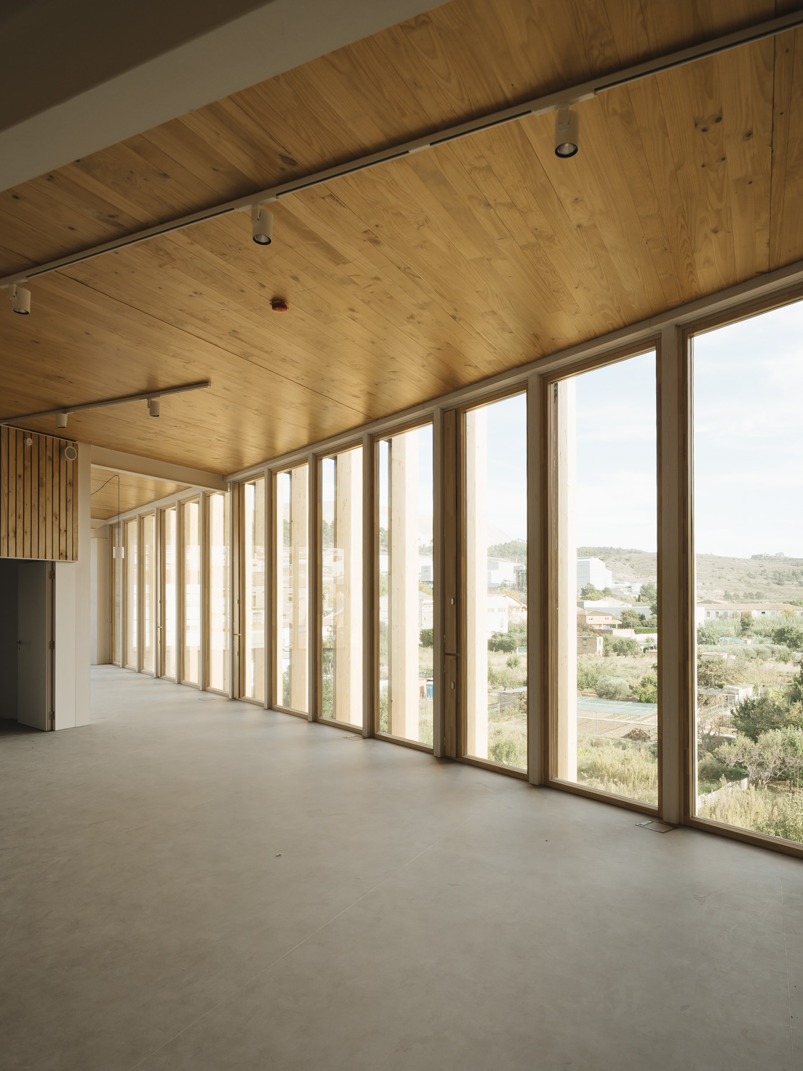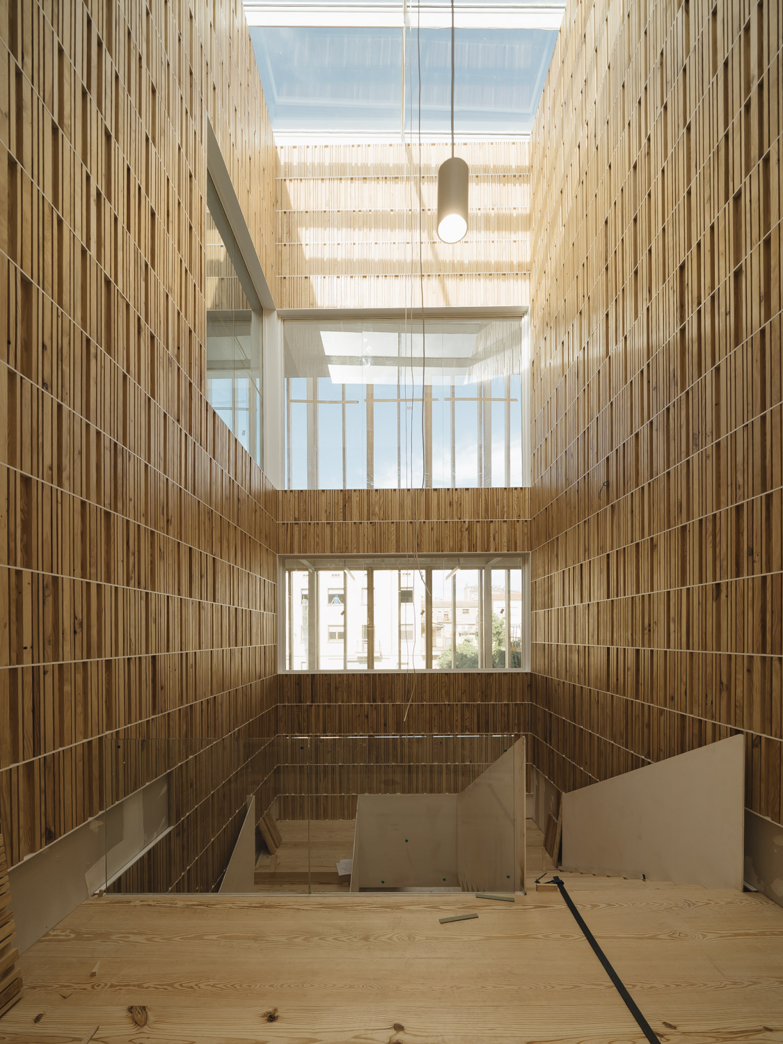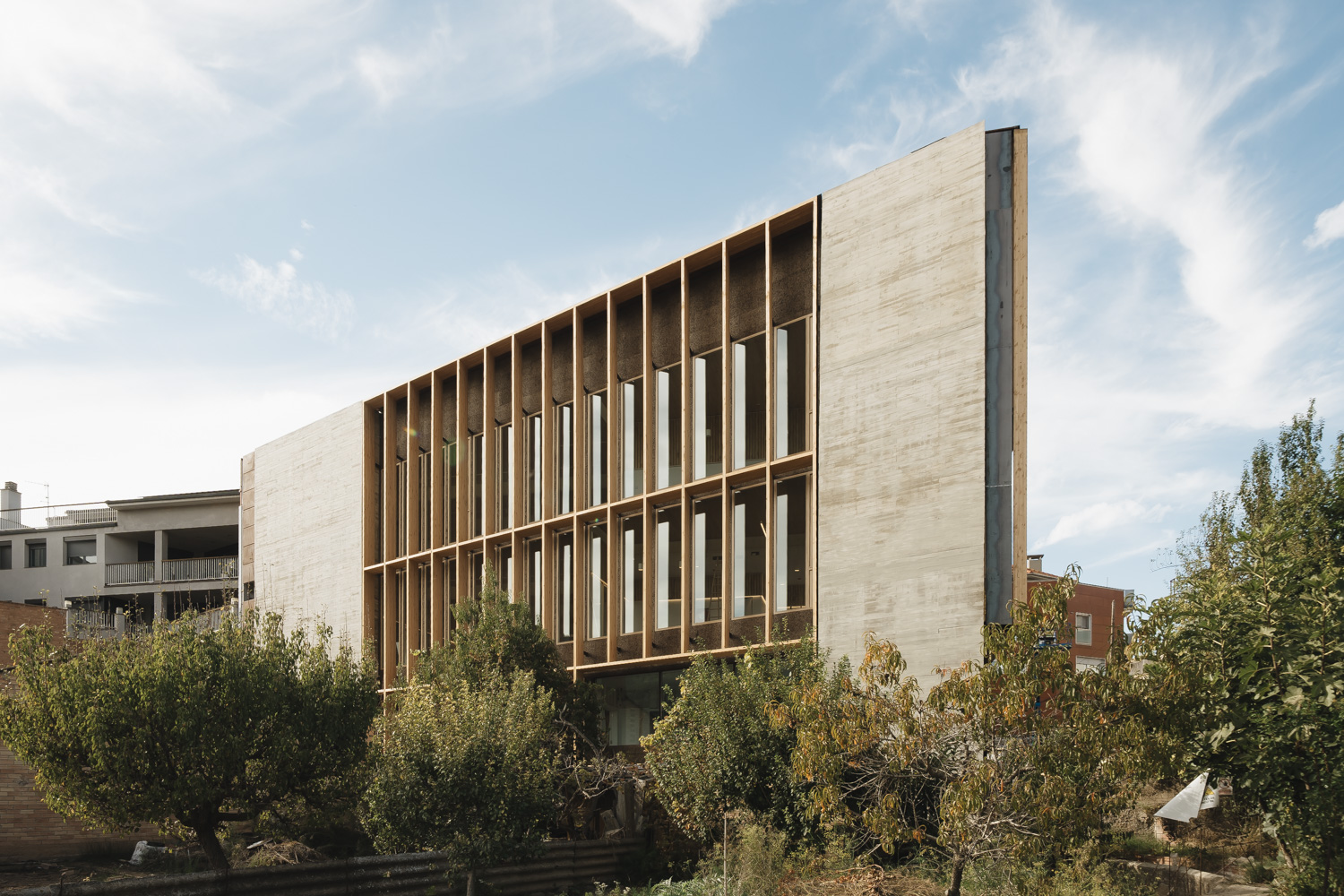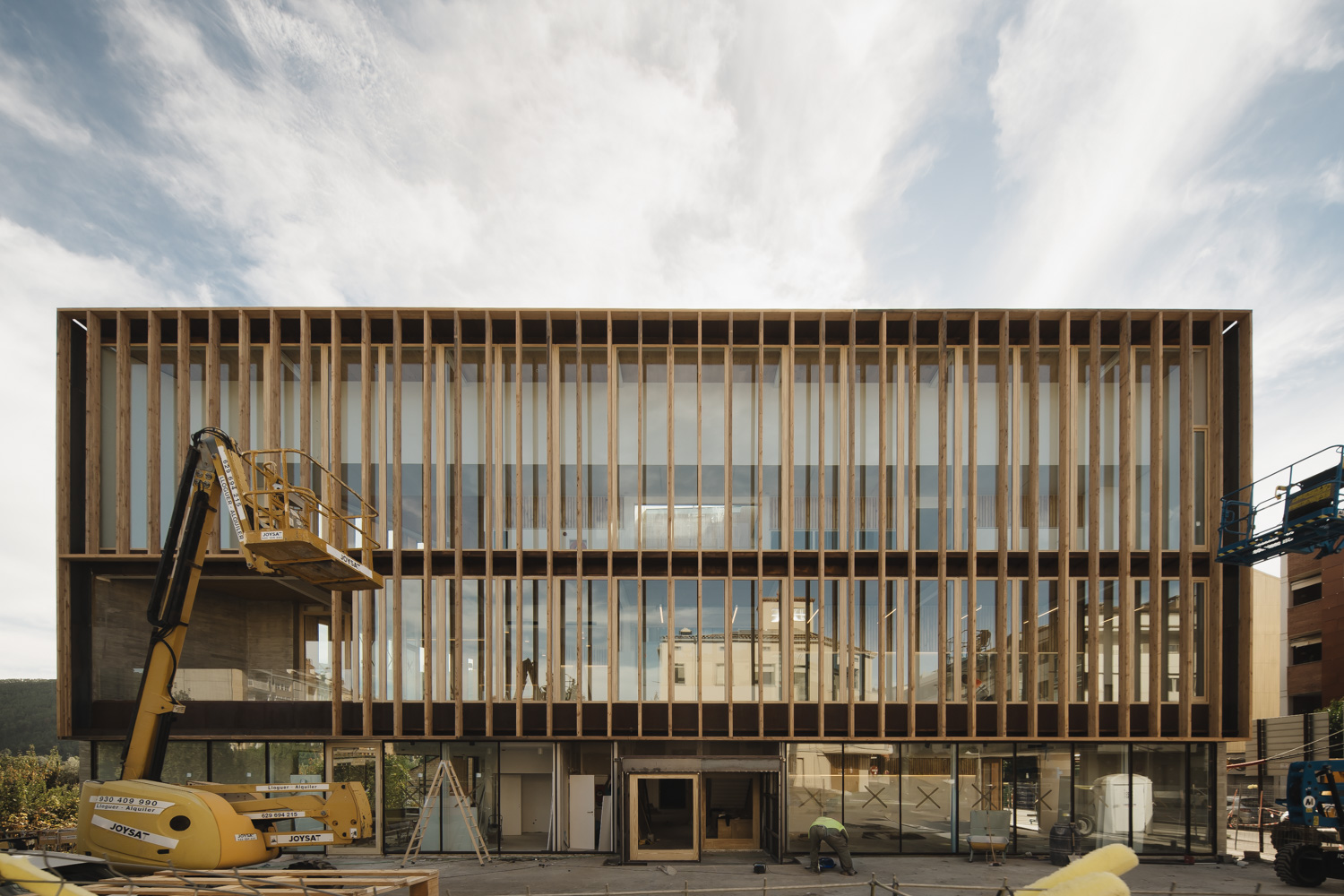 La madera define la identidad del edificio, destacando su fachada principal, concebida como un gran telón de fondo para la nueva plaza pública y compuesta por imponentes lamas verticales. Este sistema actúa como un filtro natural y regulador solar, que sumado al lucernario central y la ventilación cruzada, asegura un comportamiento energético óptimo. El edificio también cuenta con una estructura mixta de metal y CLT.