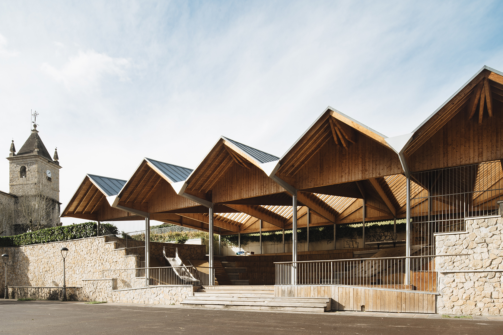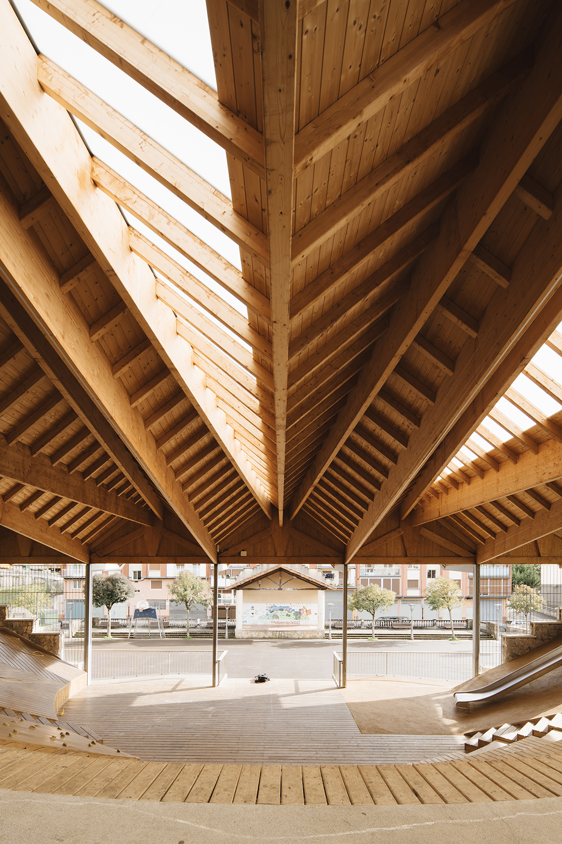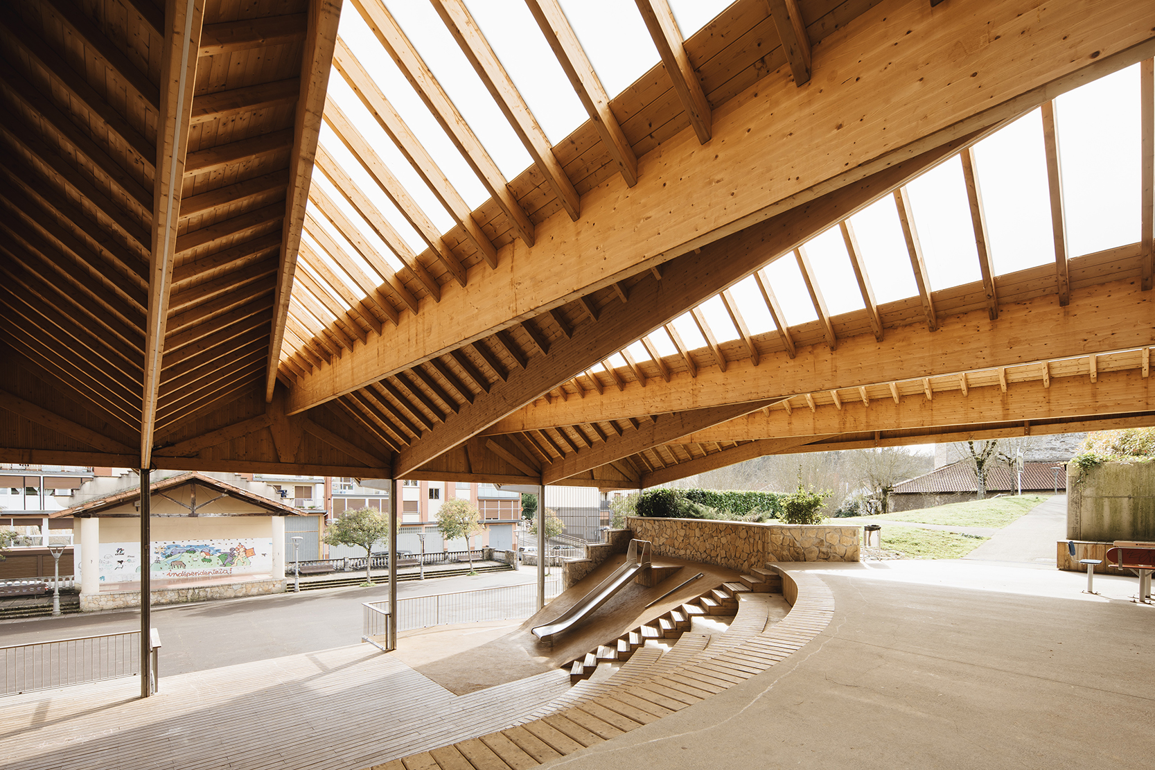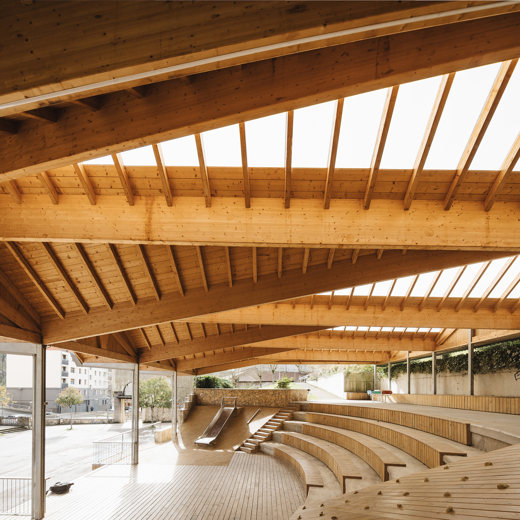 El reto que asumimos en este proyecto fue materializar una gran cubierta que permitiera a los vecinos disfrutar de su espacio emblemático durante todo el año, independientemente de la lluvia o el frío. Lejos de imponer una estética fría o ajena al lugar, la madera se presentó como la elección más lógica y respetuosa para dialogar con el paisaje y la tradición constructiva del entorno, aportando al mismo tiempo una imagen rotundamente contemporánea.