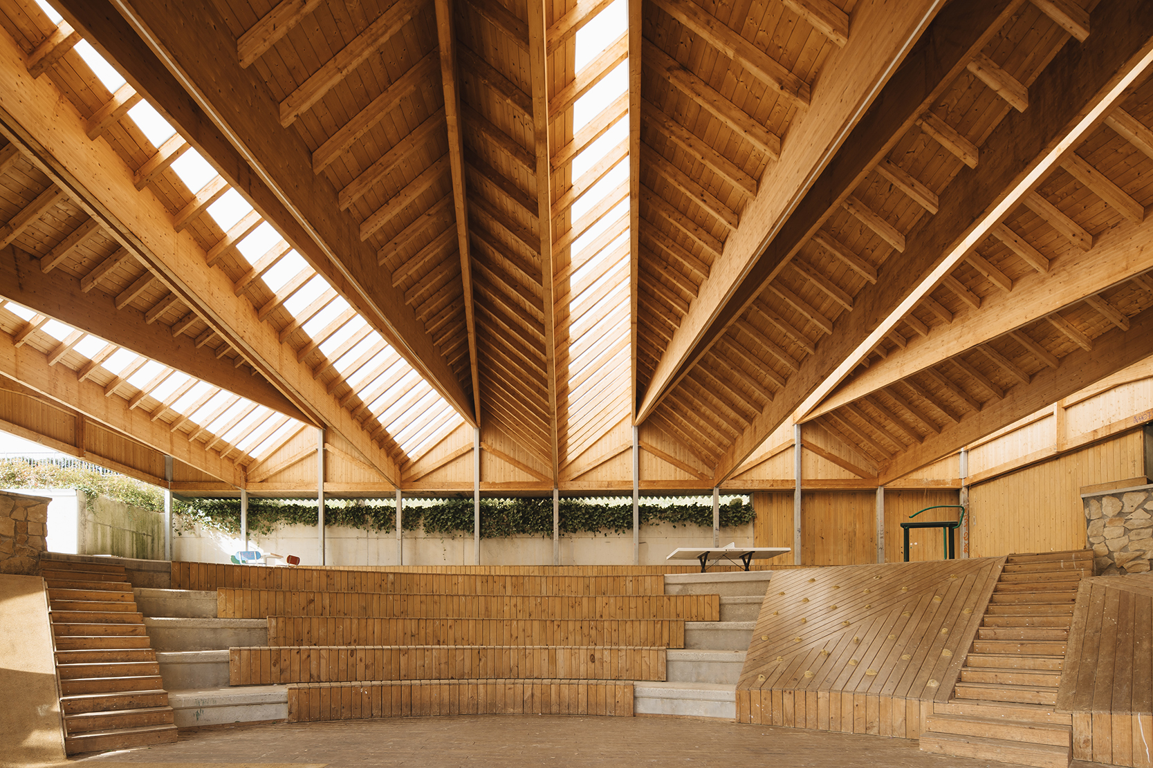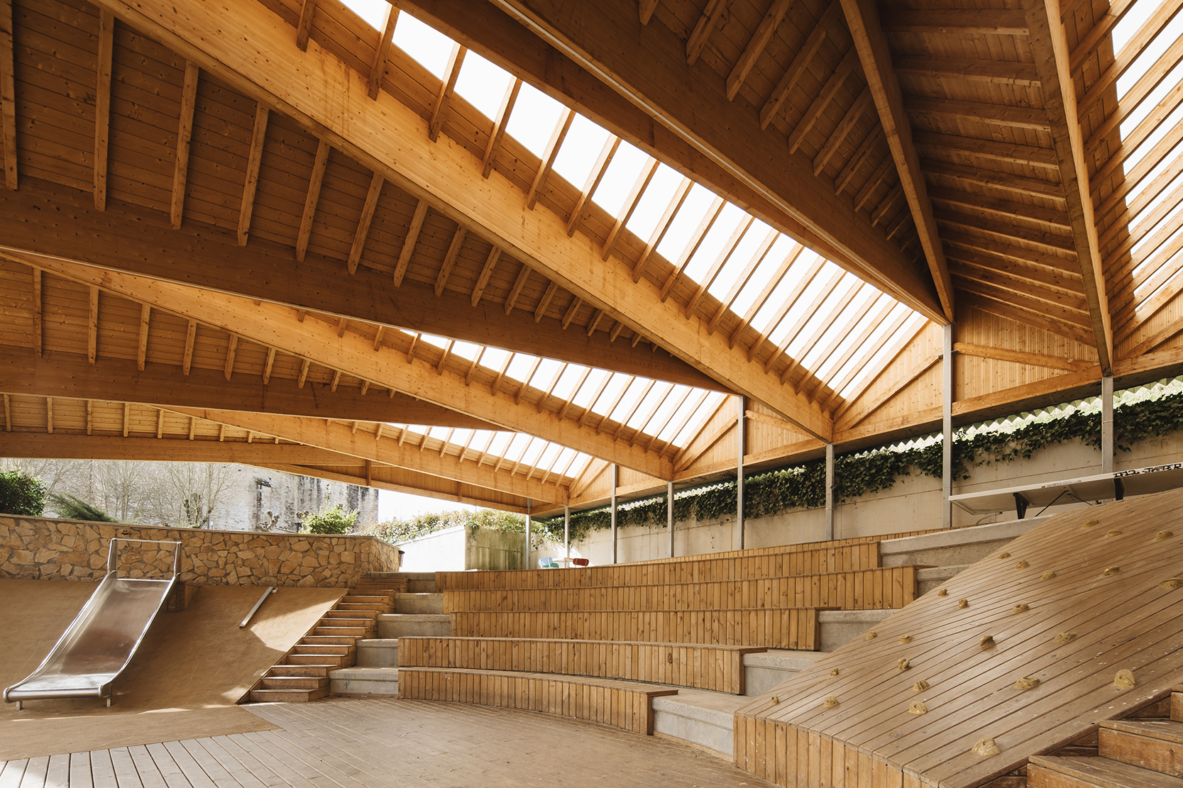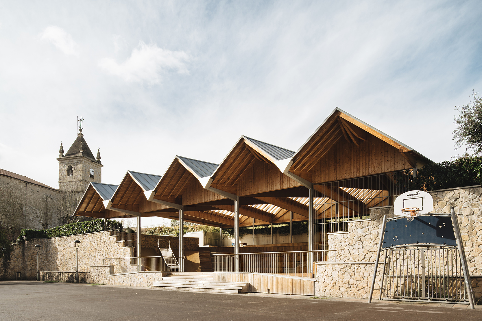 El reto que asumimos en este proyecto fue materializar una gran cubierta que permitiera a los vecinos disfrutar de su espacio emblemático durante todo el año, independientemente de la lluvia o el frío. Lejos de imponer una estética fría o ajena al lugar, la madera se presentó como la elección más lógica y respetuosa para dialogar con el paisaje y la tradición constructiva del entorno, aportando al mismo tiempo una imagen rotundamente contemporánea.