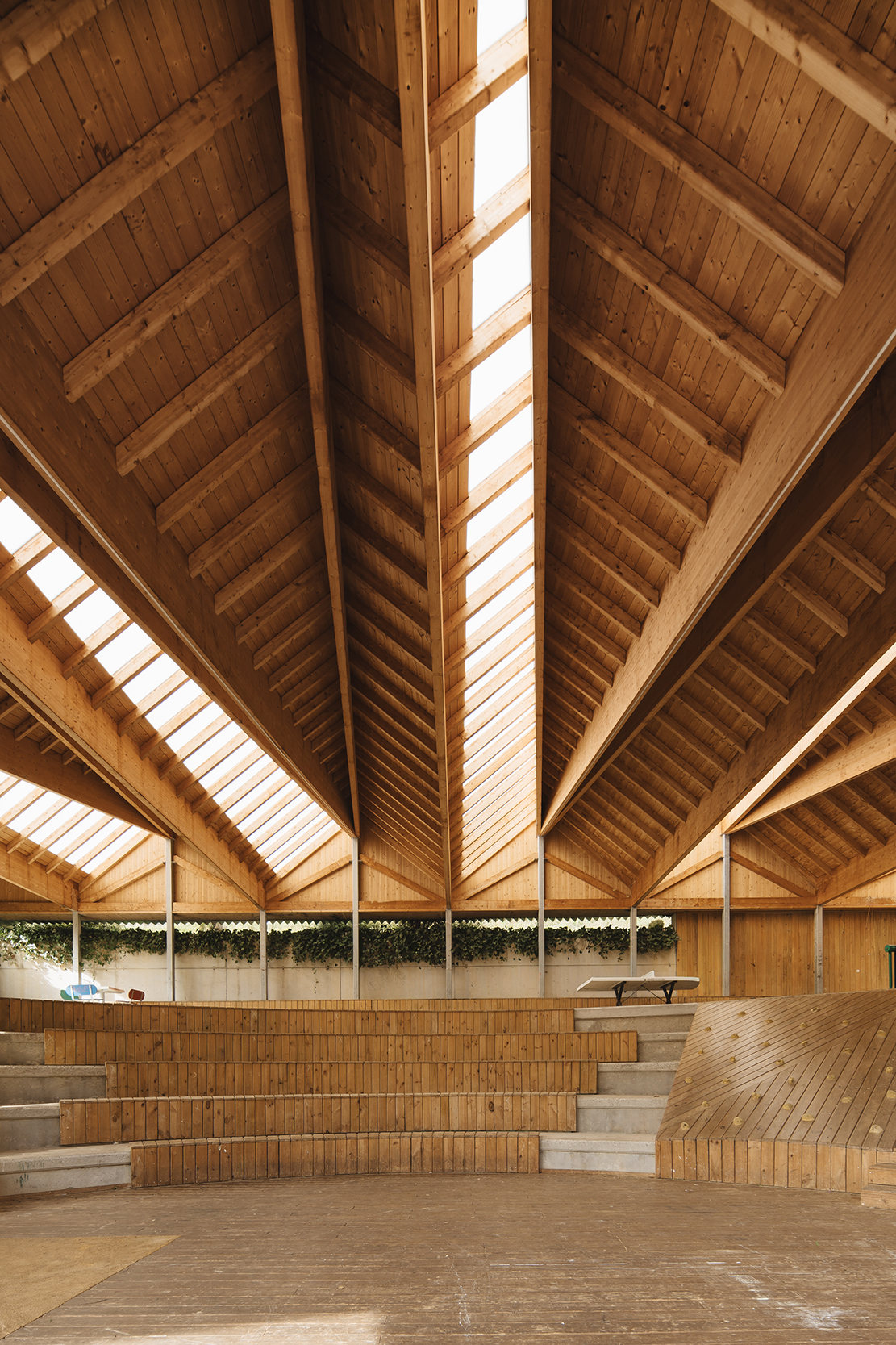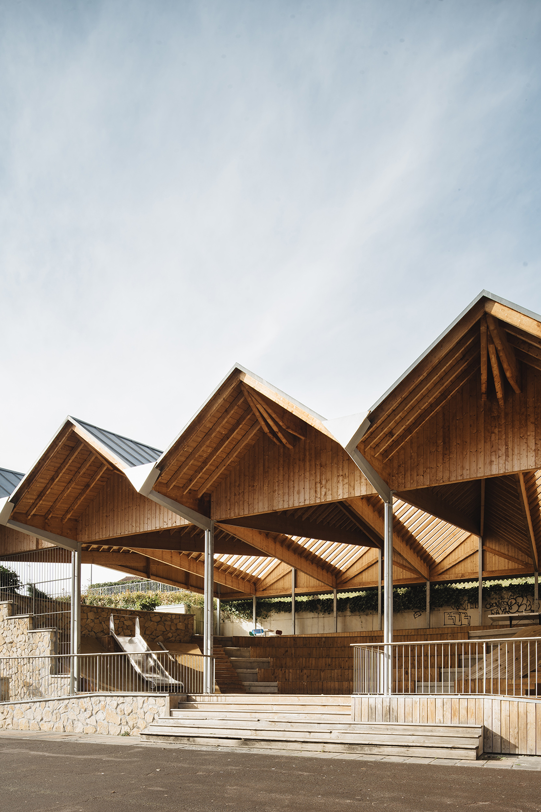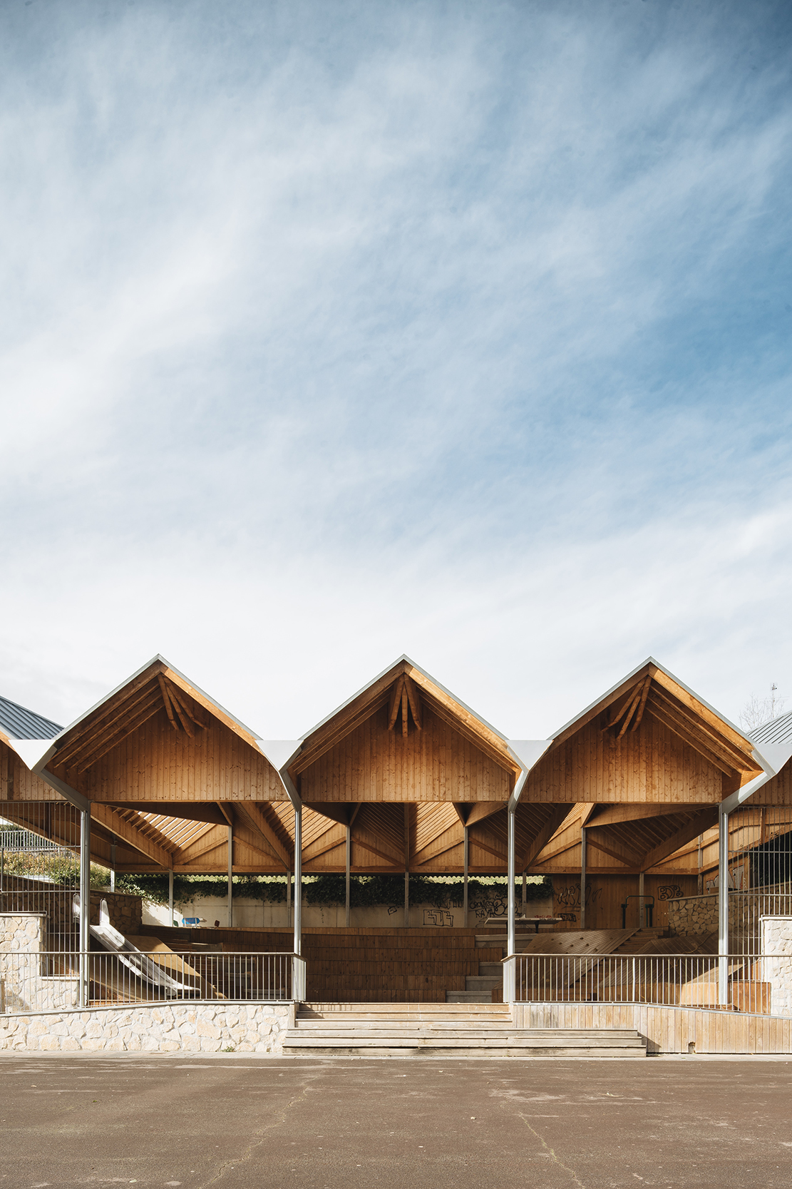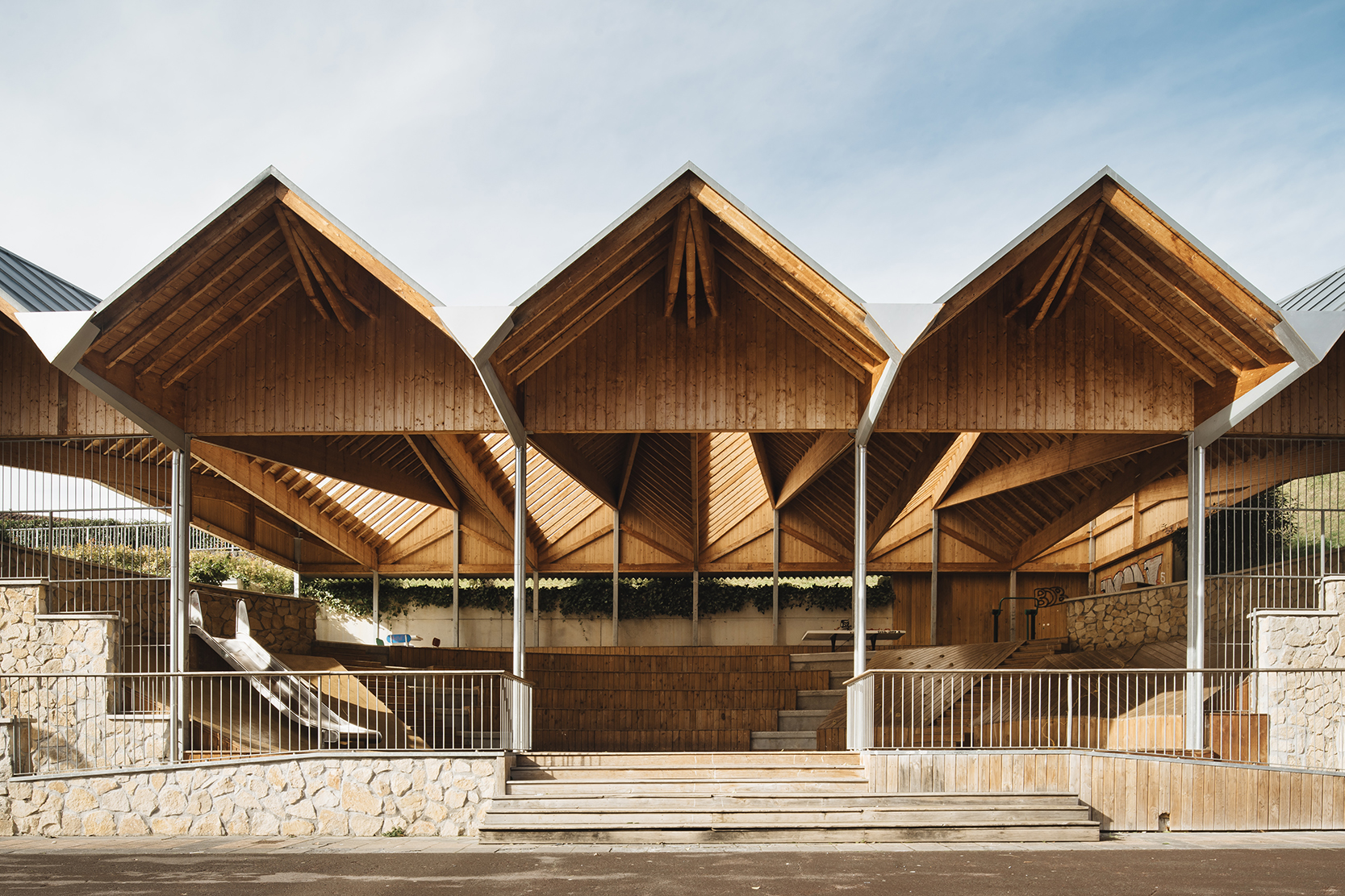 El reto que asumimos en este proyecto fue materializar una gran cubierta que permitiera a los vecinos disfrutar de su espacio emblemático durante todo el año, independientemente de la lluvia o el frío. Lejos de imponer una estética fría o ajena al lugar, la madera se presentó como la elección más lógica y respetuosa para dialogar con el paisaje y la tradición constructiva del entorno, aportando al mismo tiempo una imagen rotundamente contemporánea.