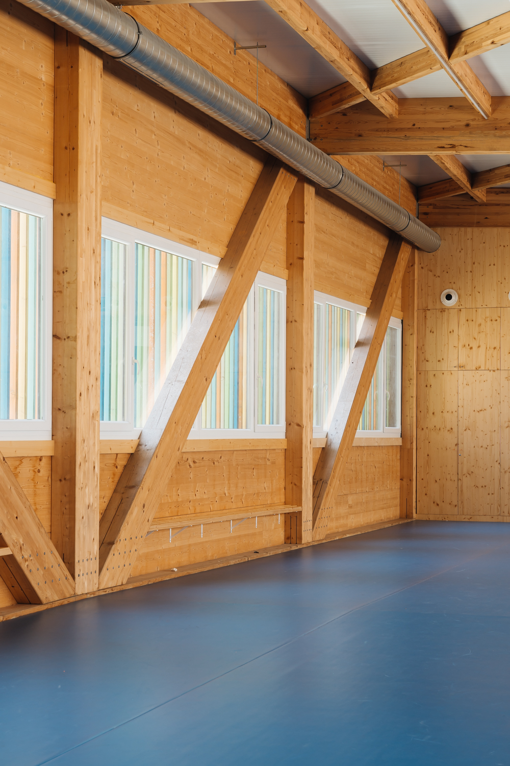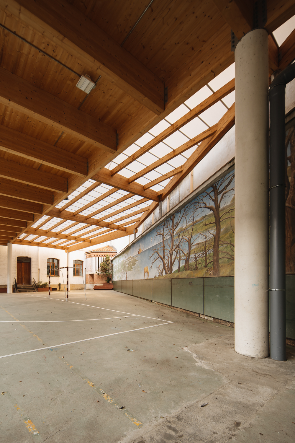 El volumen del nuevo gimnasio se articula como una pieza funcional, luminosa y abierta visualmente a la ciudad. La estructura de madera define una envolvente clara, donde los ritmos estructurales dialogan con la arquitectura existente y generan una atmósfera cálida en el interior. El conjunto se completa con una cubierta ligera que protege sin encerrar, favoreciendo la ventilación natural y el confort de uso durante todo el año.