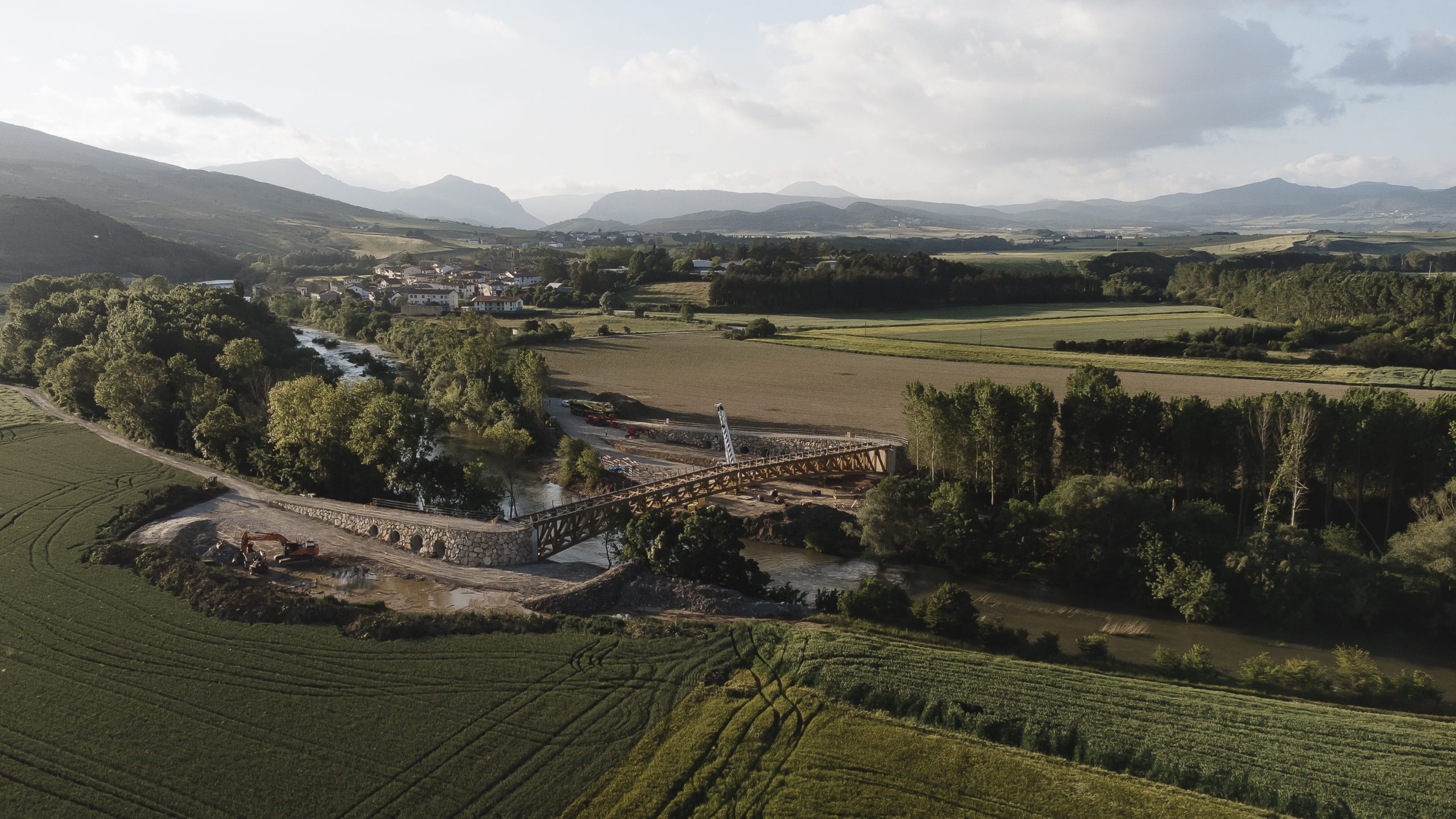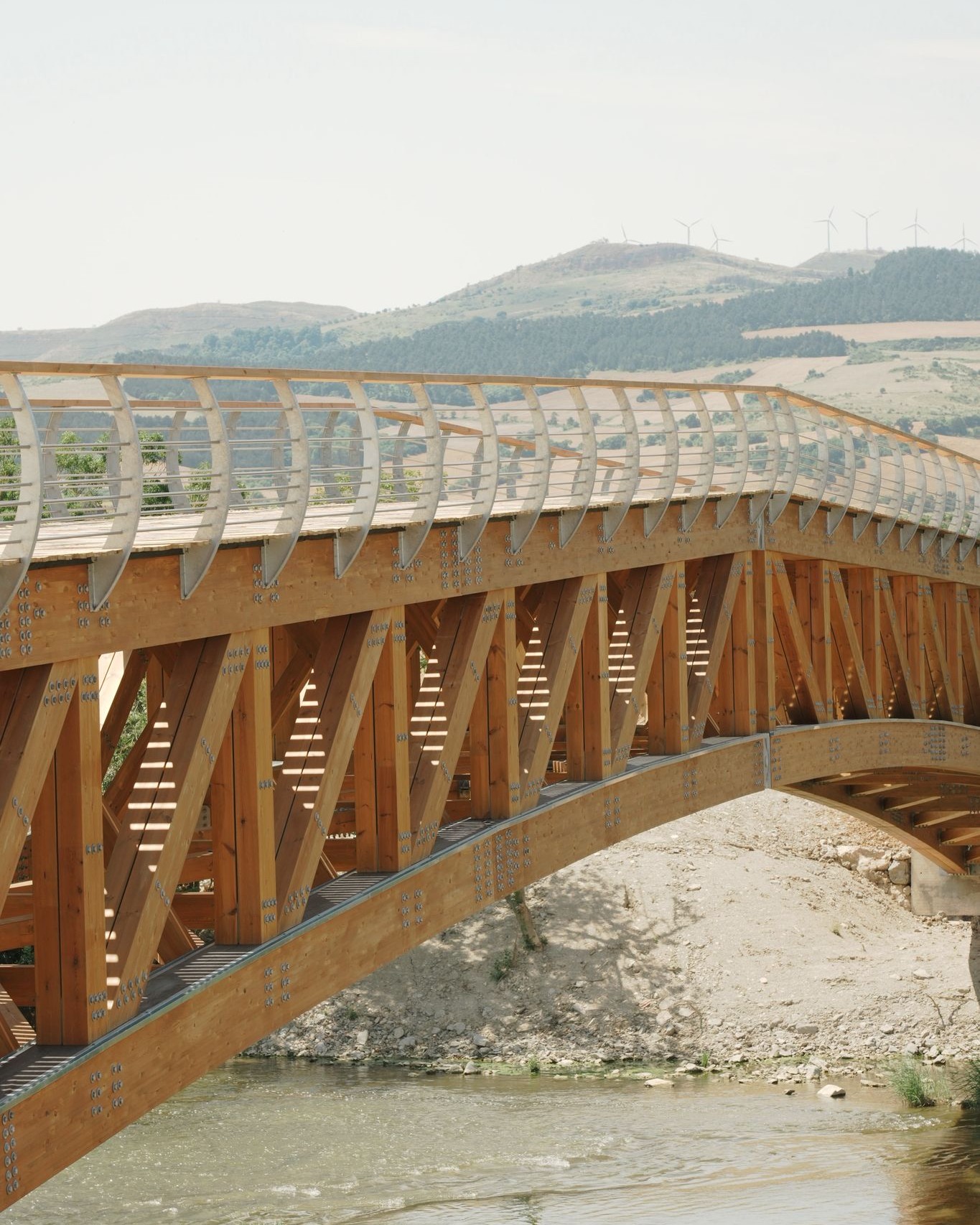 La pasarela de madera sobre el río Arakil, entre los municipios navarros de Etxauri e Ibero, es un proyecto emblemático que supone un verdadero hito en la construcción industrializada en madera a nivel internacional. Diseñada, fabricada e instalada íntegramente por Madergia para Construcciones Mariezcurrena, esta infraestructura destaca por contar con el vano más largo del mundo construido en madera para una pasarela peatonal.